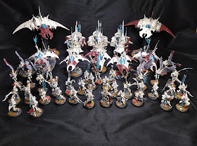 El año 2020 comenzó como un año donde quería conseguir pintar lo justo y necesario porque se me presentaba el examen de las oposiciones en junio. Por ello mi planificación de pintura era algo ligera, en la lista tenía solo planeado ampliar algo los Eldar Oscuros para terminar la lista de juego necesaria para jugar con ellos o ir a torneos con alguna lista algo dura. Pero con eso del maldito virus, el bloqueo de todo, el no poder salir, el aplazo de mis oposiciones al año siguiente y con eso de estar en casa sin poder ver a mis amigos, familiares, ni poder hacer vida normal, ni entrenar ni nada... pues se me planteo un momento dramático de mi vida, pero sin miedo ninguno decidí dedicar el tiempo a cosas fructíferas más que a ver películas y pasarme el día aburrido.